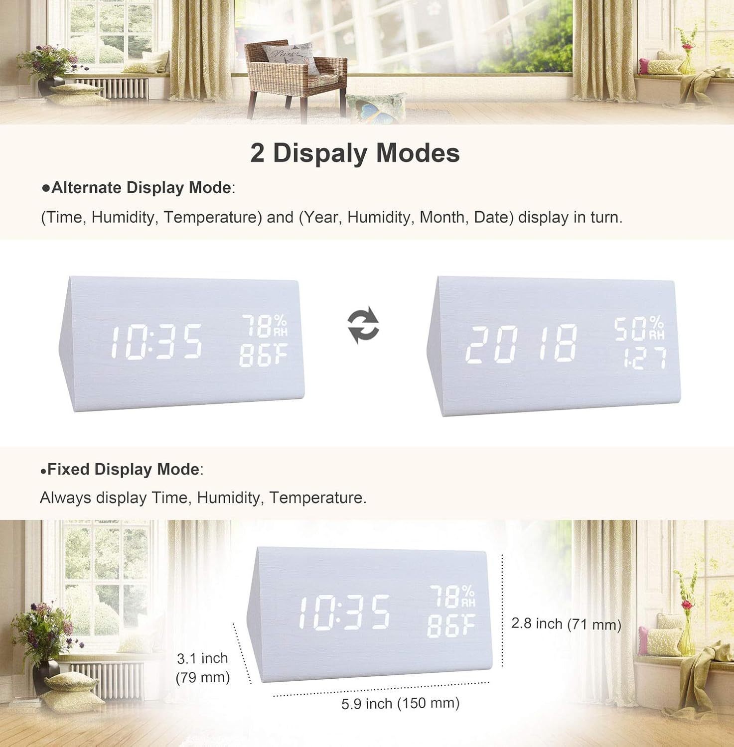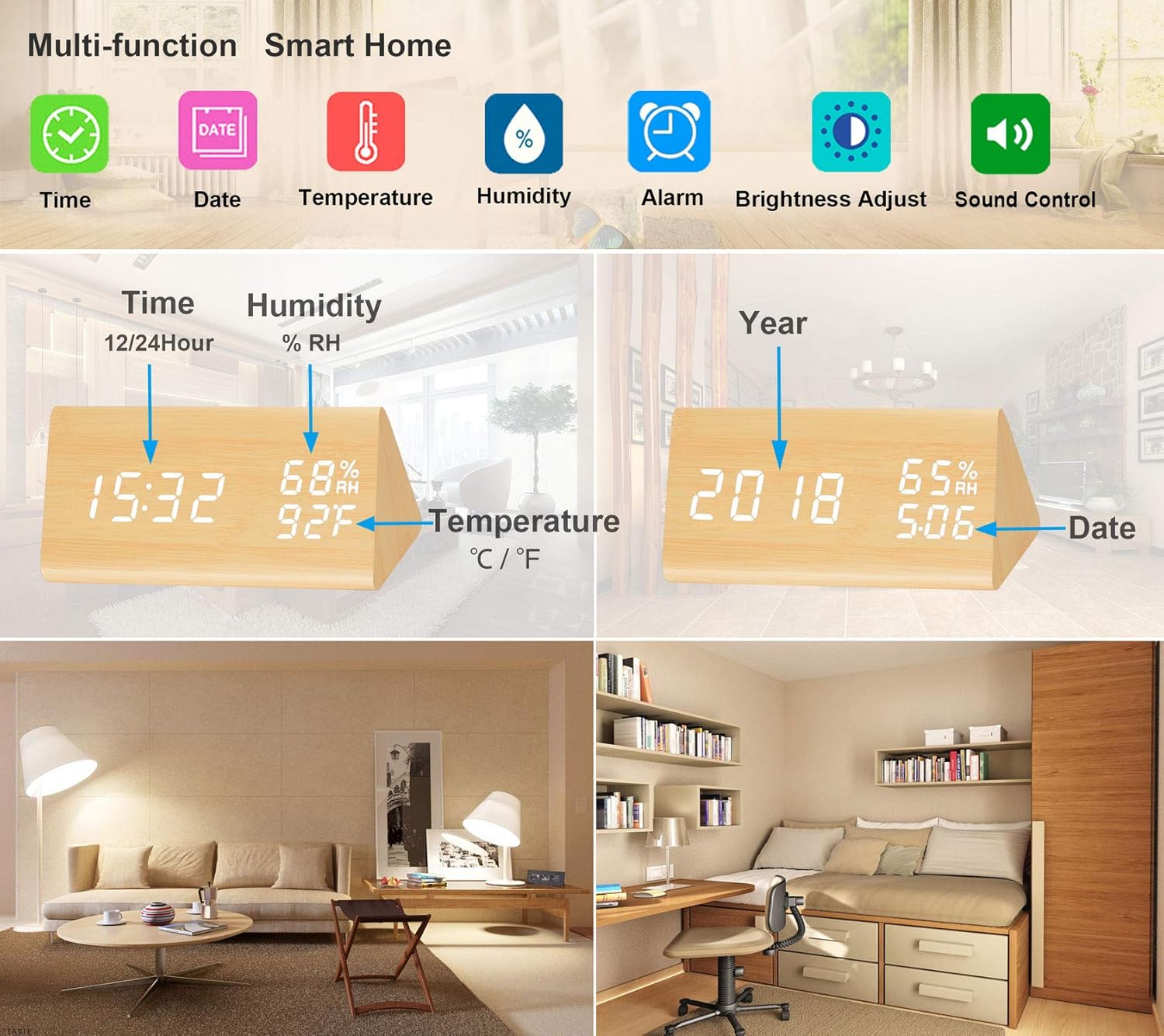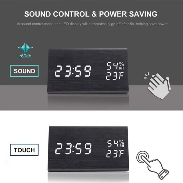 - In the sound control mode, the noise is 50-60 DB or close to the sound to wake up the smart LED wooden alarm clock, or press any button to wake up the alarm clock. The sound control function can be turned on/off.