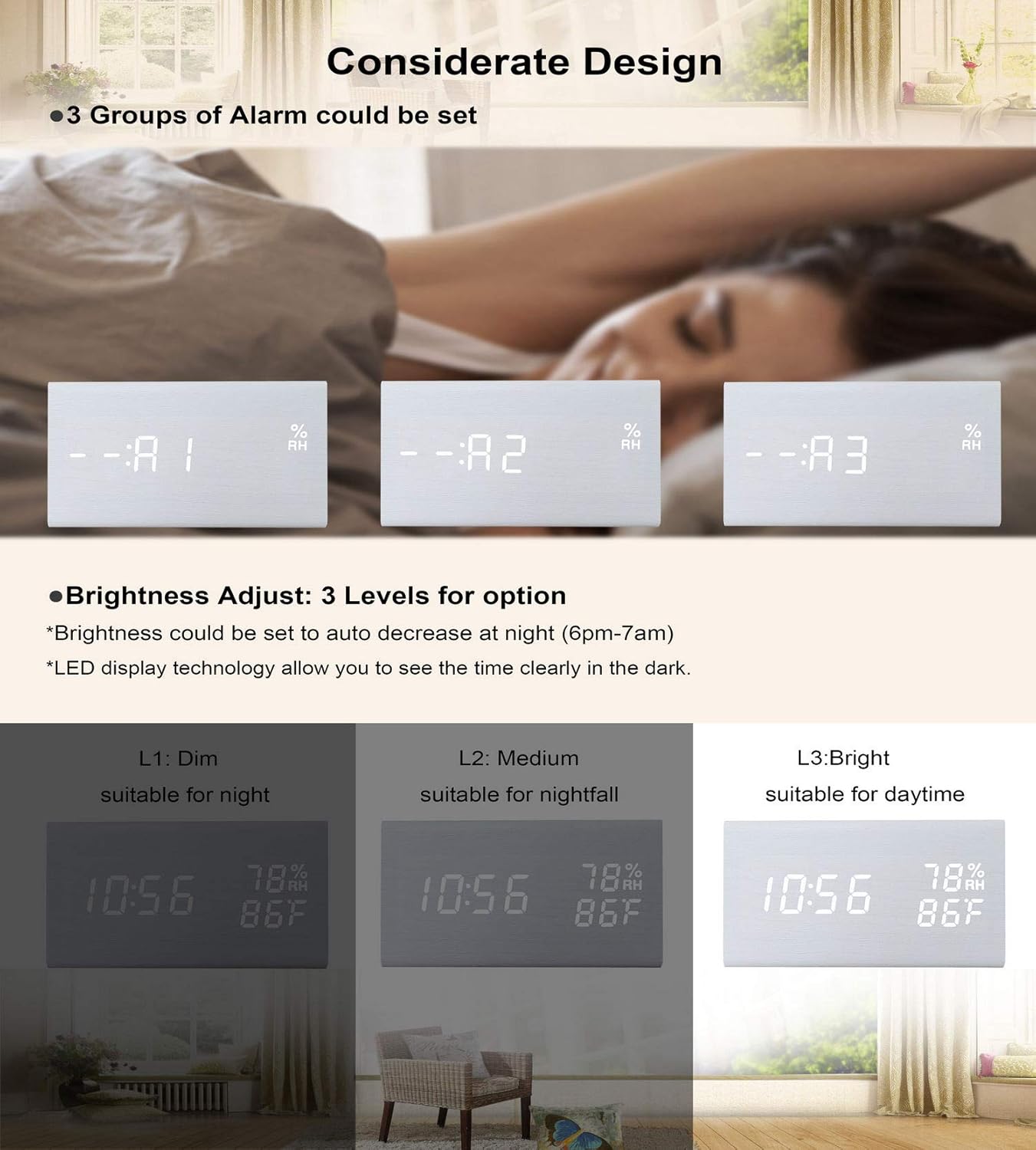 WOODEN ALARM CLOCK WITH ELECTRONIC LED TIME DISPLAY, 3 ALARM SETTINGS, HUMIDITY & TEMPERATURE DETECT, VOICE CONTROLLED